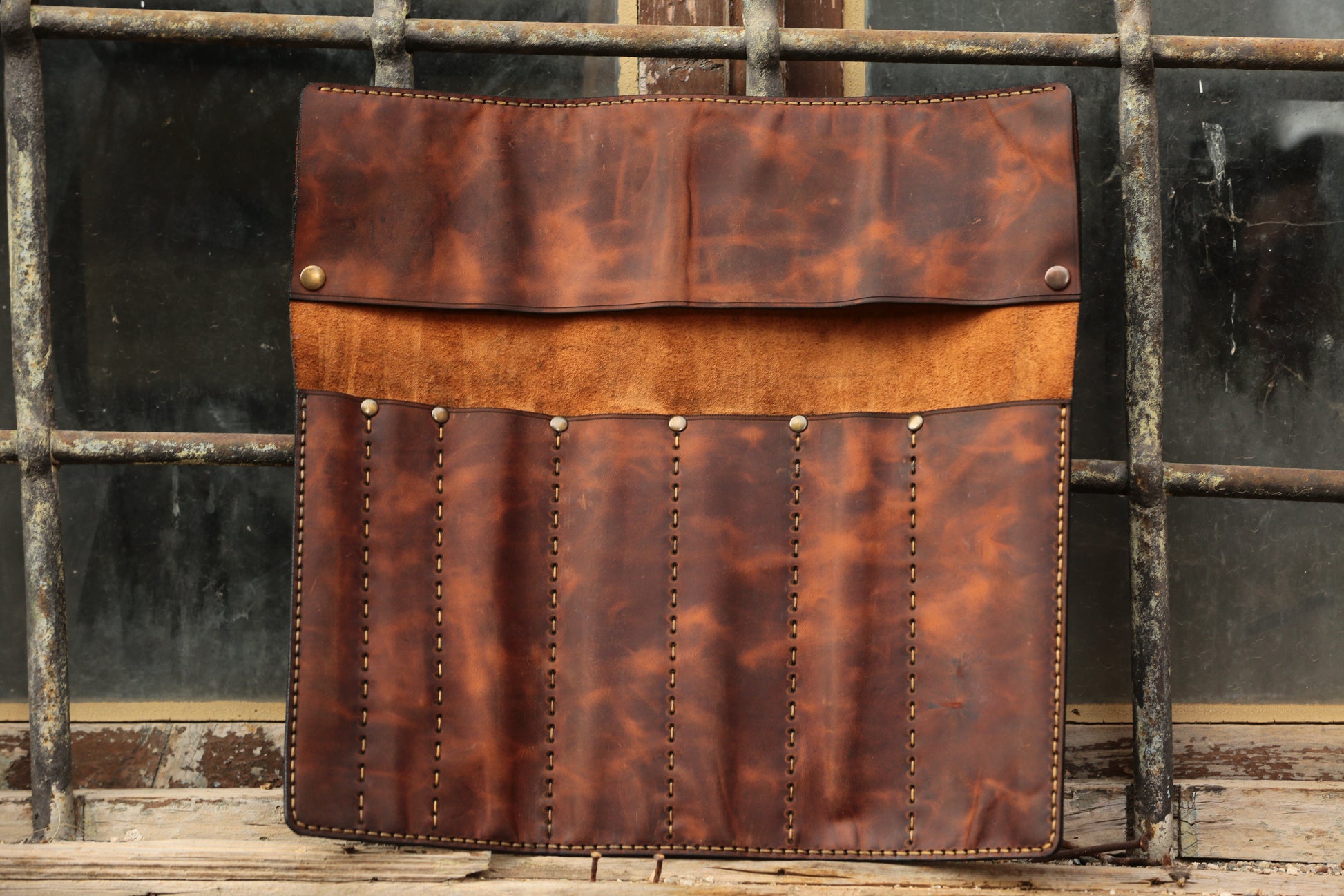 Designed to hold multiple knives and essential kitchen tools securely, this roll-up case is perfect for chefs on the go, culinary students, or anyone who values craftsmanship and functionality in their gear. The sturdy leather exterior and reinforced stitching ensure your knives stay protected during transport, while the compact design keeps everything within easy reach.