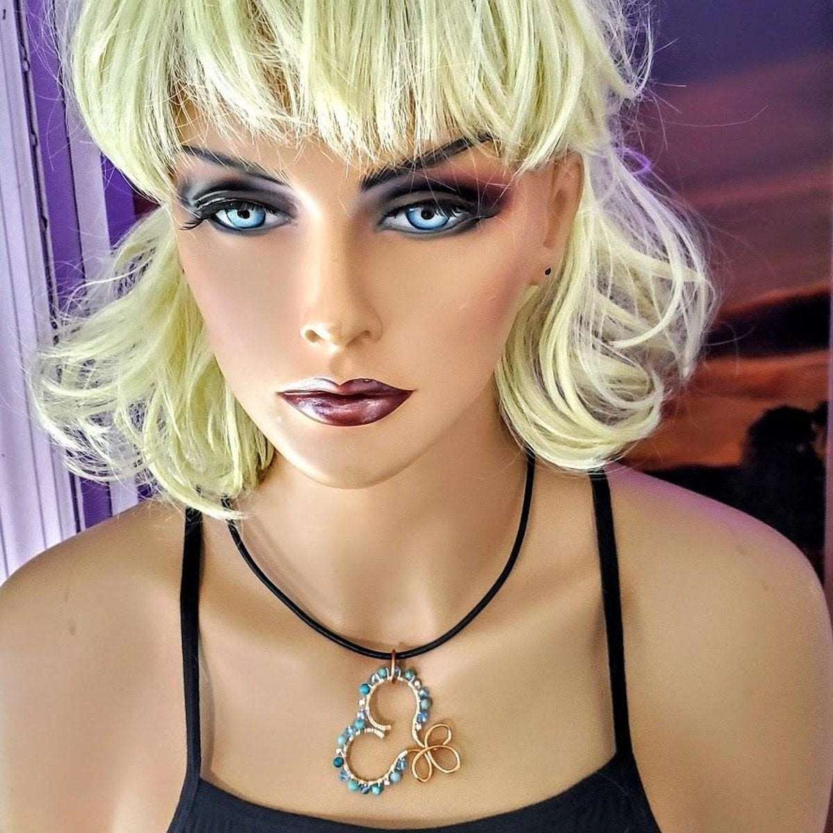 Celebrate artistry and emotion with this exquisite heart-shaped pendant, masterfully hand-hammered from solid copper wire. Intricately adorned with turquoise jasper, sterling silver, and aqua Swarovski crystals, this one-of-a-kind piece is a symbol of passion and craftsmanship.