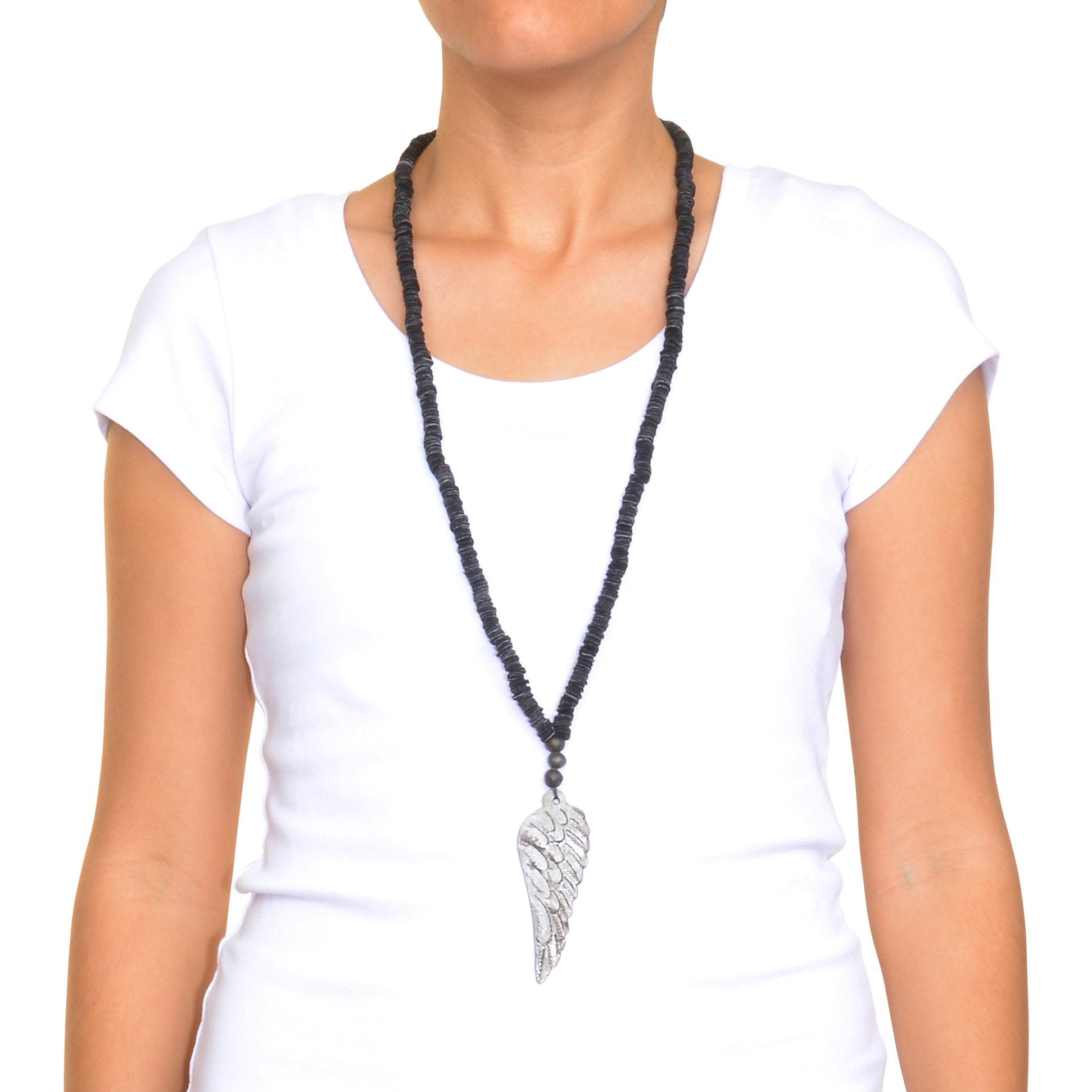 Elevate your accessory game with this striking leather necklace by Jacki Easlick®—a piece that blends refined craftsmanship with raw, urban elegance. Handcrafted from high-end cowhide, this necklace features a bold, 3.5-inch hammered metal wing, repurposed from recycled oil drums for a uniquely artistic touch. The delicate clay beads and ¼" leather sequins add layers of texture and charm, completing this Manhattan-inspired look.